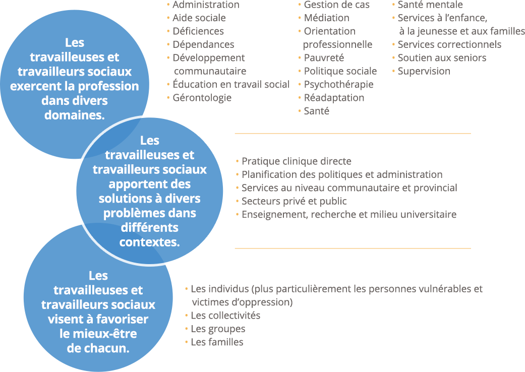 Que font exactement les travailleuses et travailleurs sociaux? Voilà une question à laquelle il est difficile de répondre, car ils possèdent de nombreuses compétences qui les amènent à travailler dans une variété de milieux très différents. À la base, les travailleuses et travailleurs sociaux sont des professionnels de la santé réglementés qui répondent aux besoins d’individus, de familles, de groupes ou de collectivités aux quatre coins du Nouveau-Brunswick. Ils étudient les effets qu’ont les facteurs familiaux, communautaires, juridiques, sociaux, spirituels et économiques sur le mieux-être des gens et s’efforcent d’éliminer les obstacles qui peuvent se présenter. En somme, les travailleuses et travailleurs sociaux veillent à identifier les personnes ayant besoin d’aide et travaillent ensuite avec elles pour améliorer leur situation.